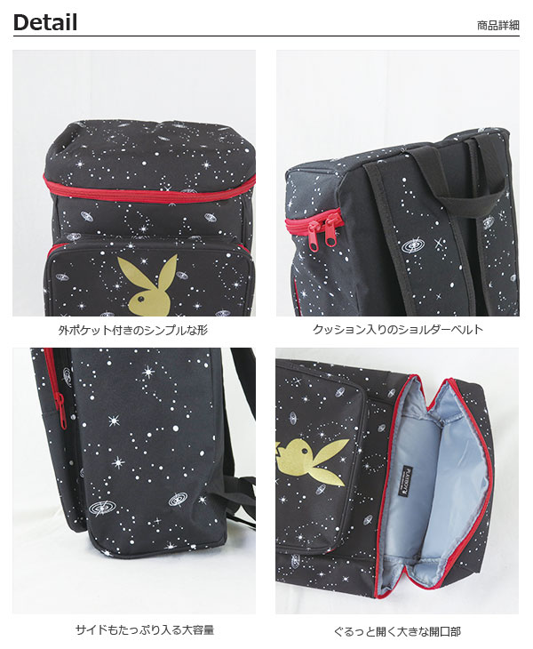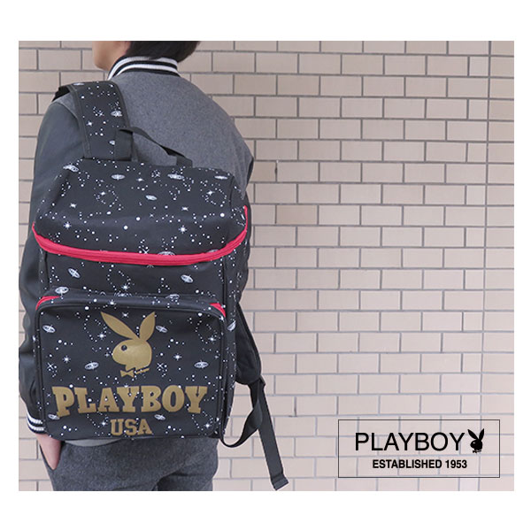 商品説明 ブラックとホワイトをベースにスペース柄も加わったPLAYBOYリュック。