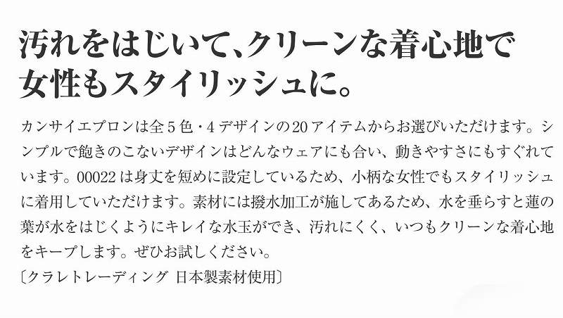 カンサイエプロンは全5色・4デザインの20アイテムからお選びいただけます。